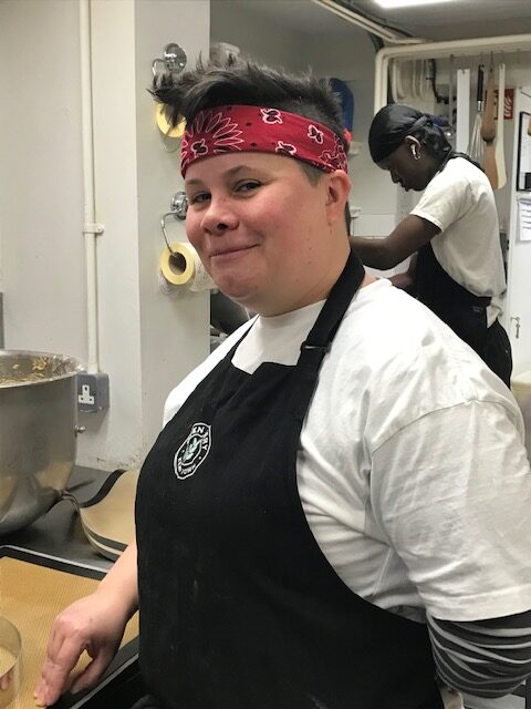 It’s just after 7am when I meet Airam in their knotted red headscarf and blue-grey apron. A large smile stretches across their face and their cheeks have a cherry bloom. They have just arrived on shift. Normally cycling in, they tell me, but today they took the bus and the roads were jammed. We’re in the kitchen below the shop floor at the Open Bakery. I’m struck by the number of fridges in such a small space and the expanse of clear chrome surfaces. While we talk, Leigh who’s been on the night shift since 3am, is piping smooth crème pat into pastry cases, ready for the plump fresh raspberries and blueberries that have just arrived from a local greengrocer.